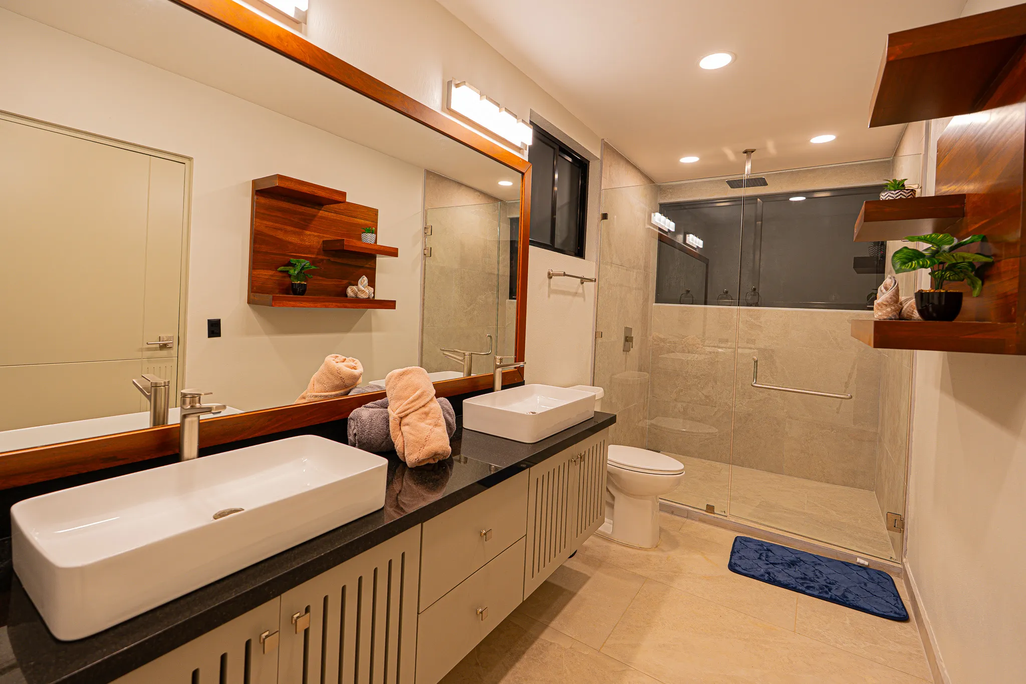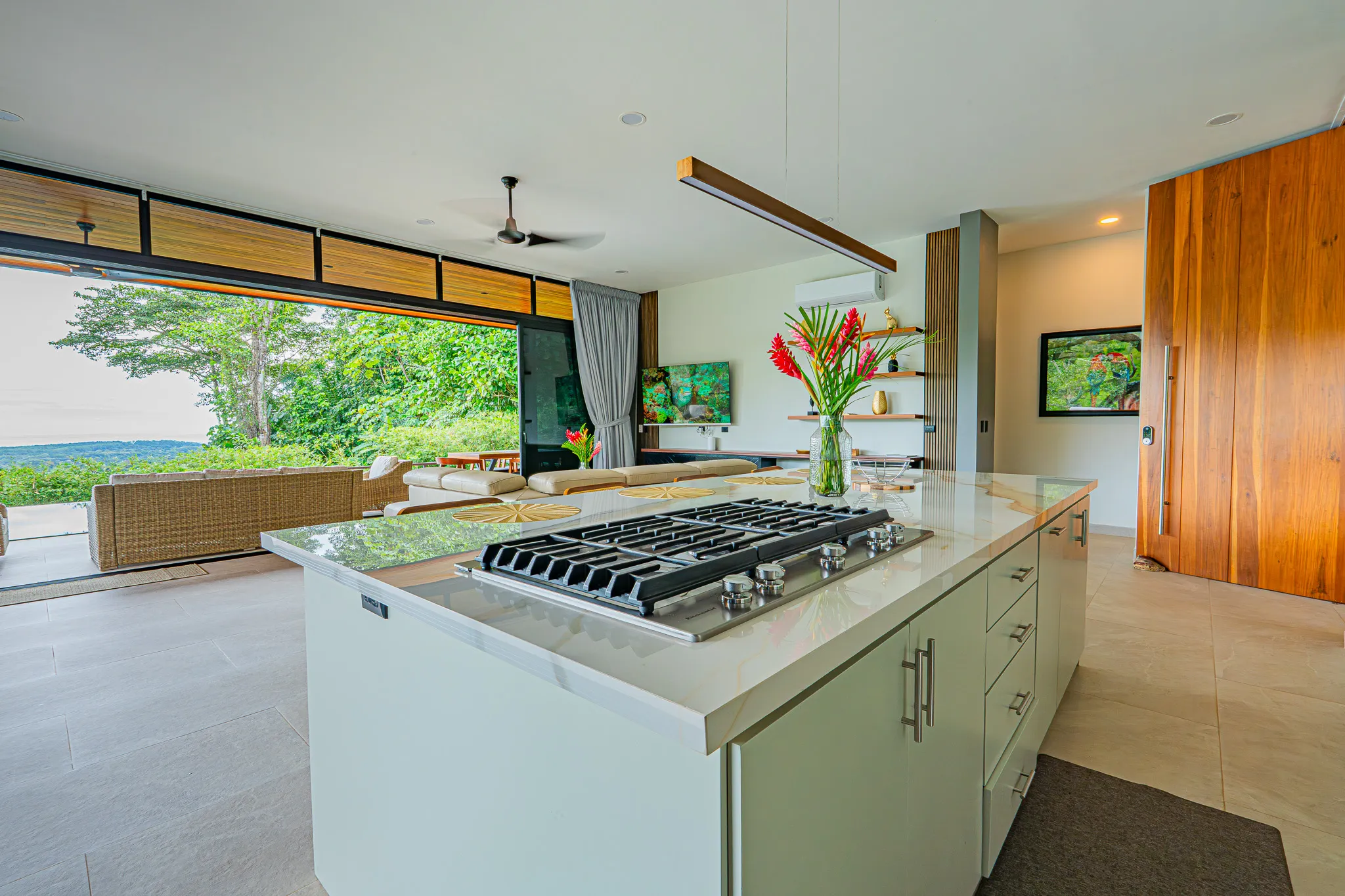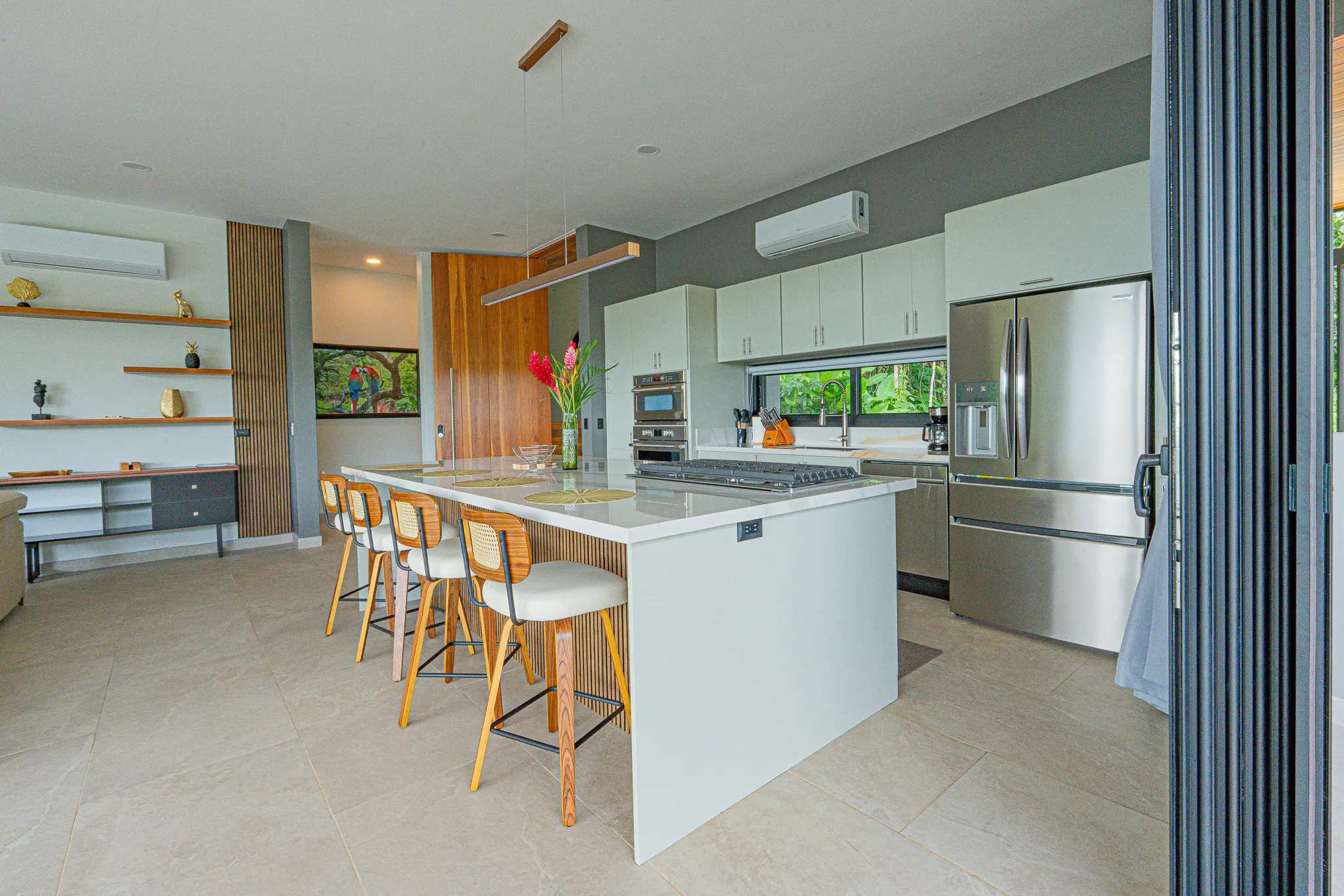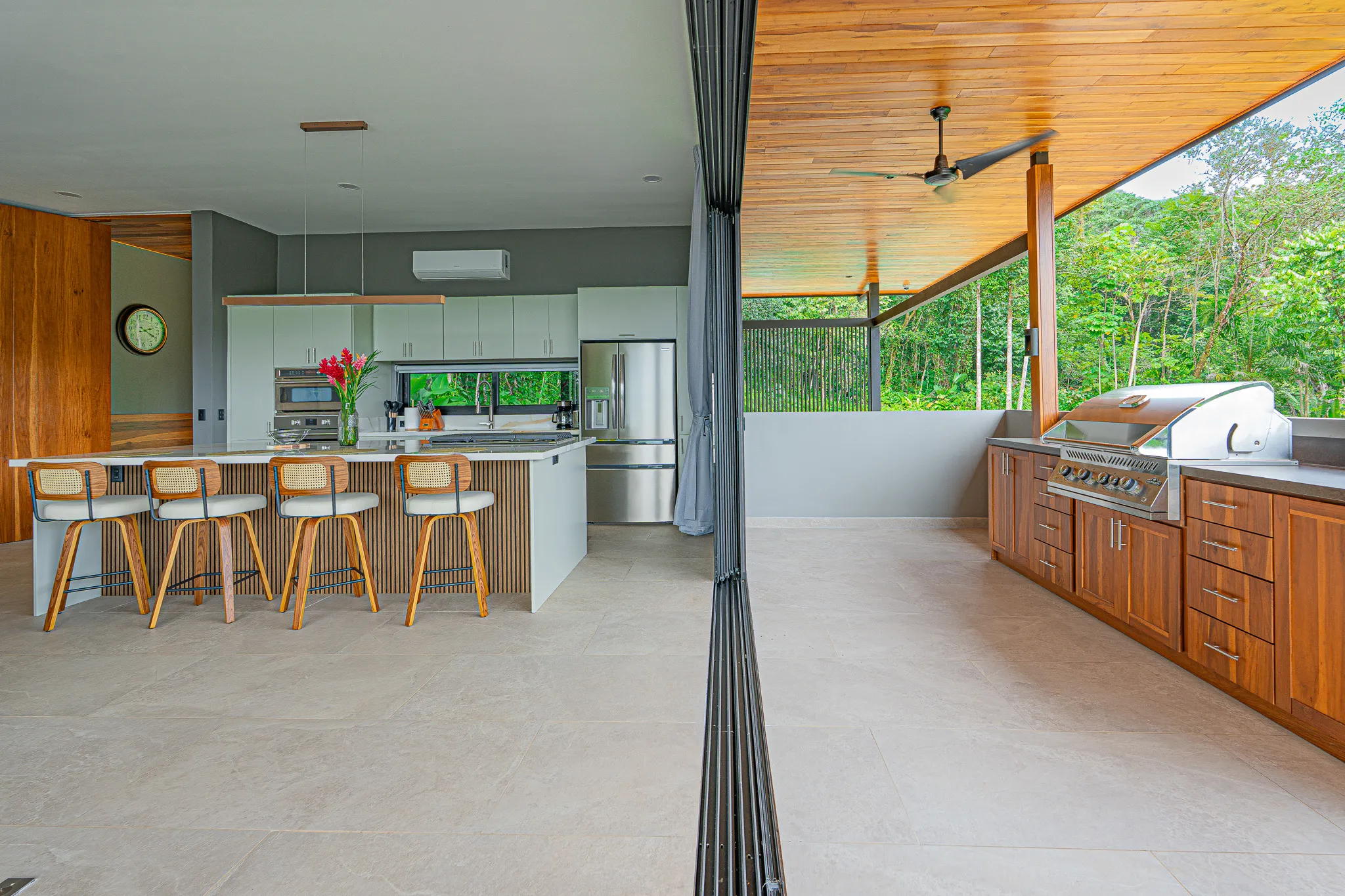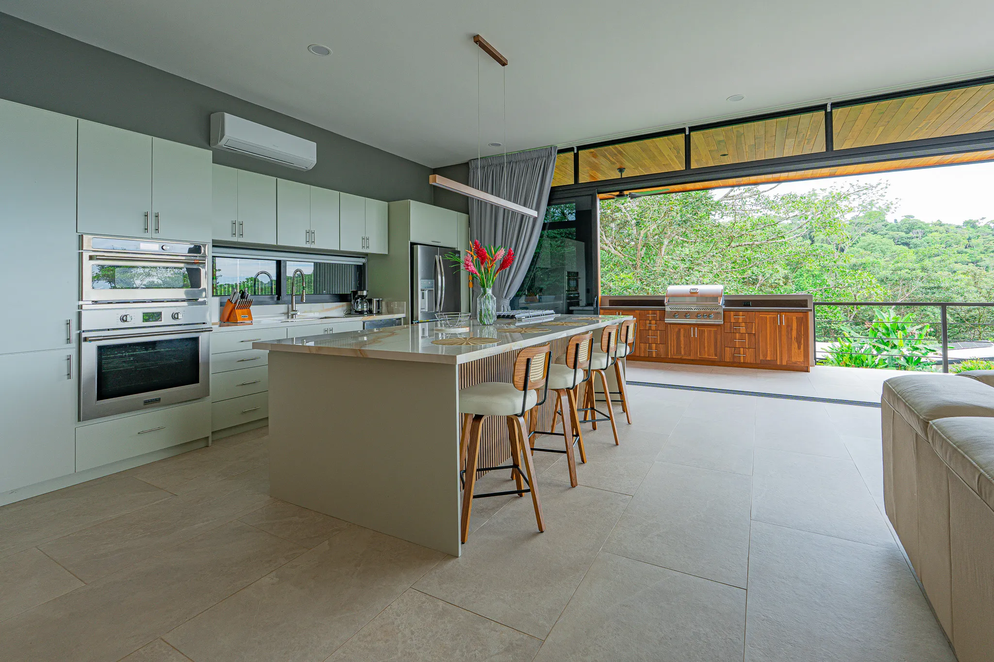 Incorporamos piedra sinterizada en áreas clave como la cocina, el BBQ y el baño principal, y granito en los baños secundarios, logrando un balance entre durabilidad y estética contemporánea.