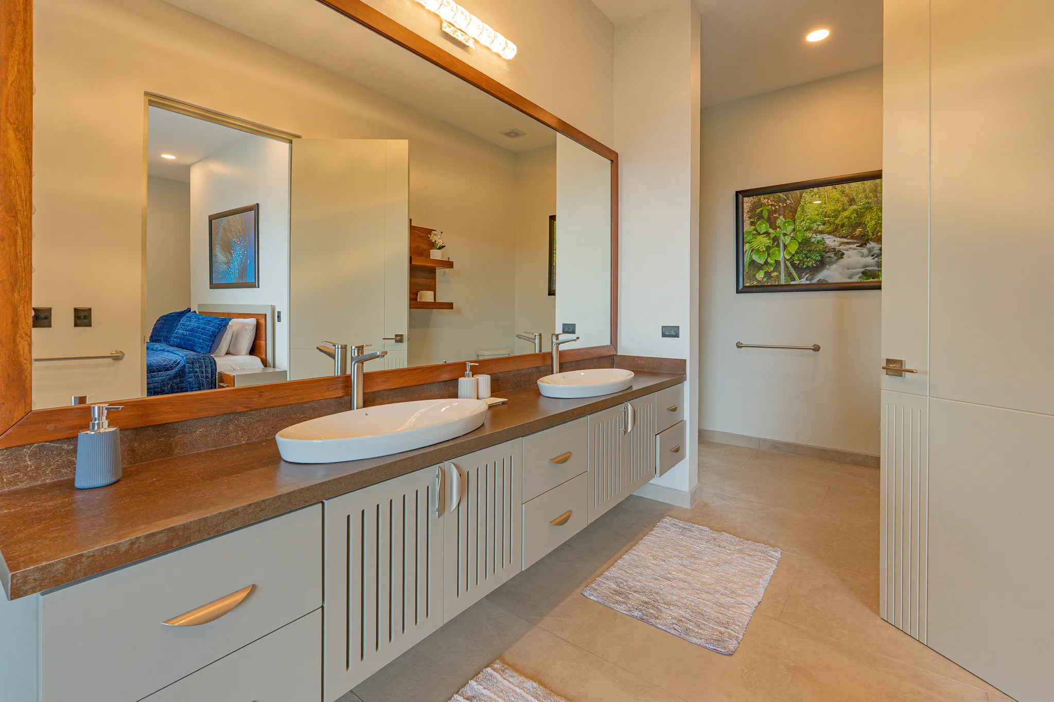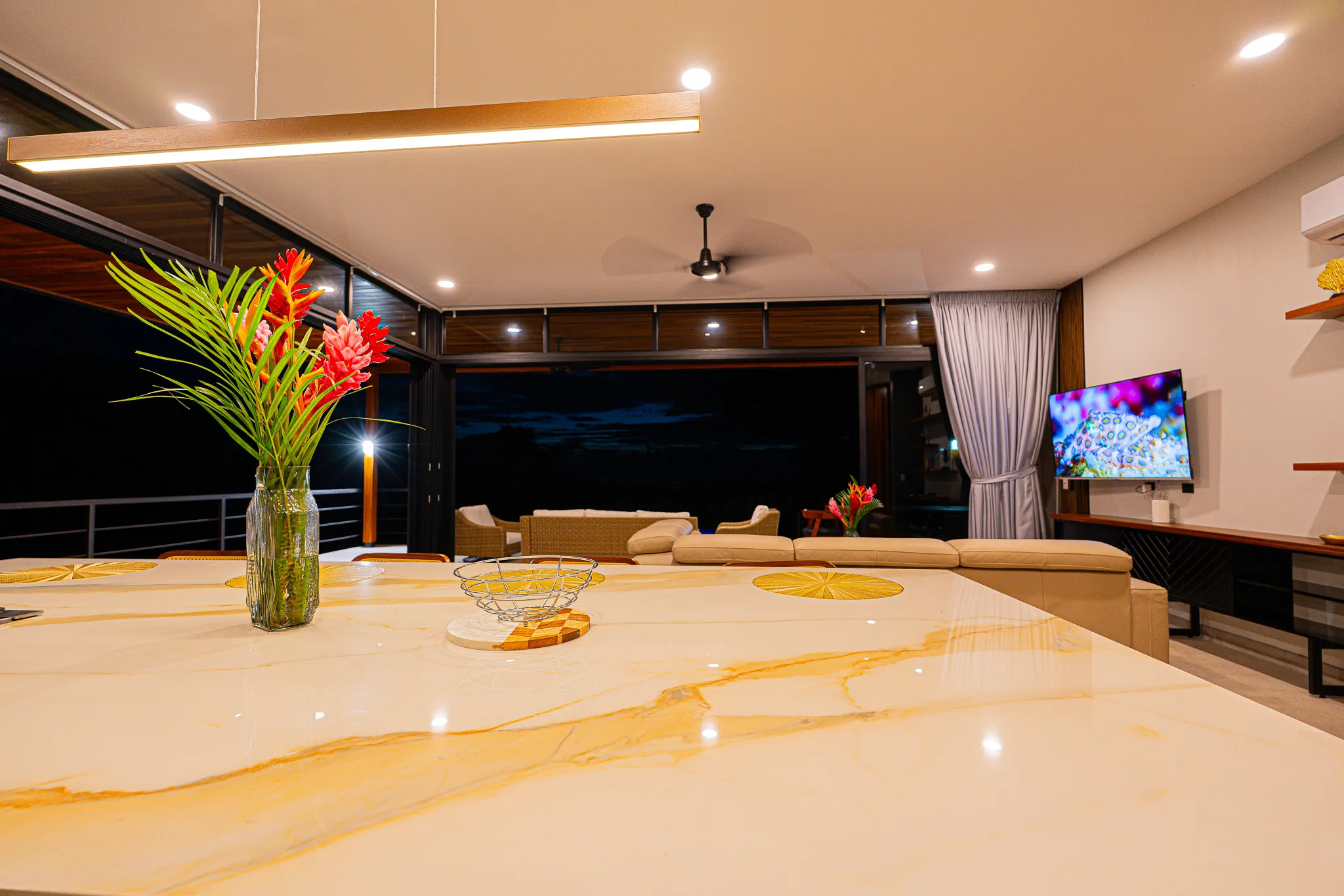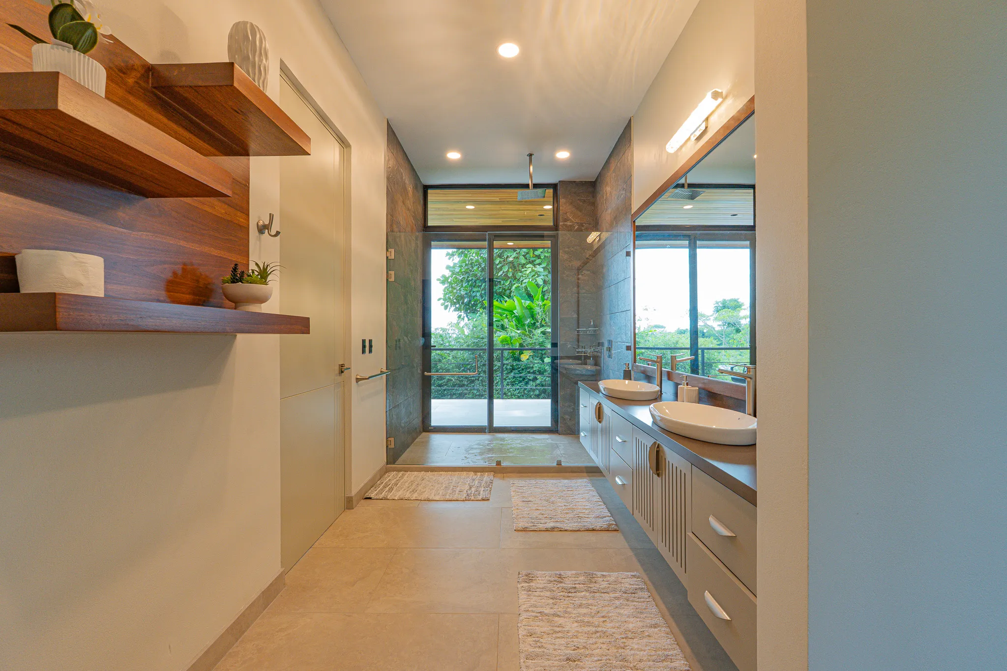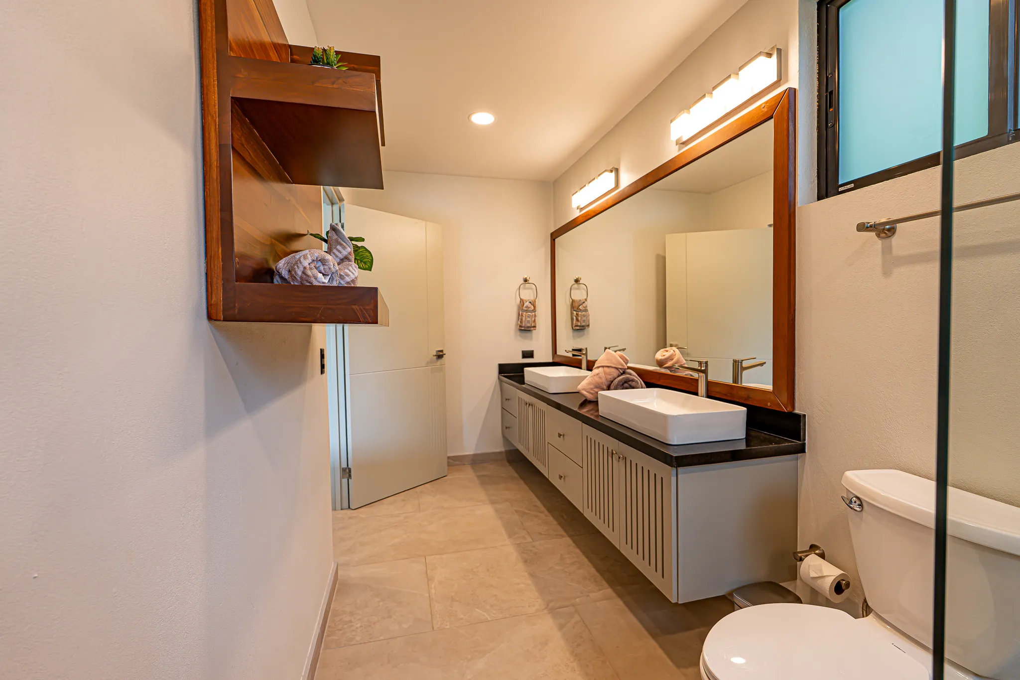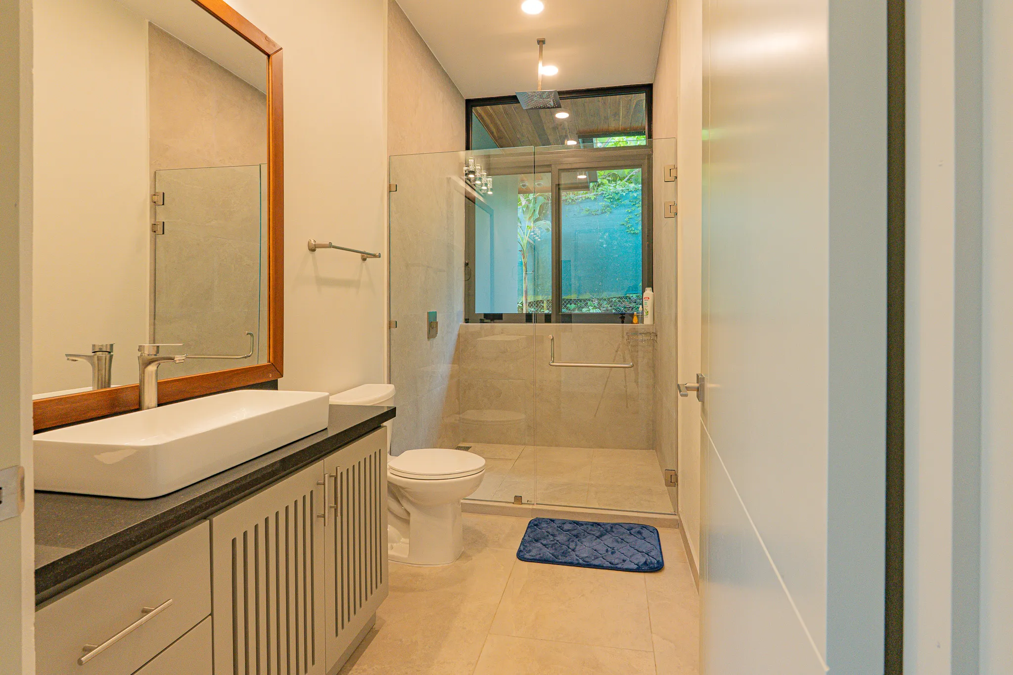 Incorporamos piedra sinterizada en áreas clave como la cocina, el BBQ y el baño principal, y granito en los baños secundarios, logrando un balance entre durabilidad y estética contemporánea.